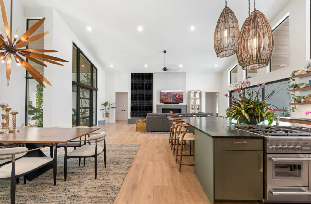 This remodel opted for rich wood and statement pendant lighting, giving a cozy forest feel while still remaining stylish, serene, and understated. With plants, tonal textures on the walls, and excellent natural light, this house is showstopping and perfectly suited to its owners.
